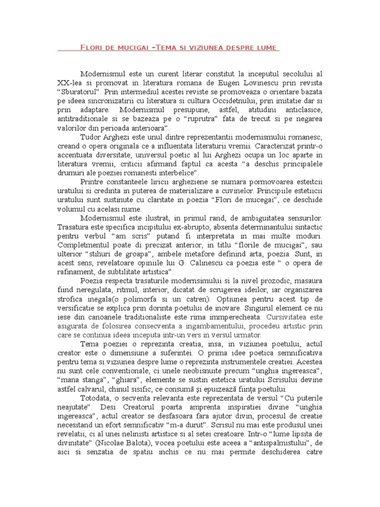 Flori De Mucigai Comentariu Tema Si Viziunea Despre Lume